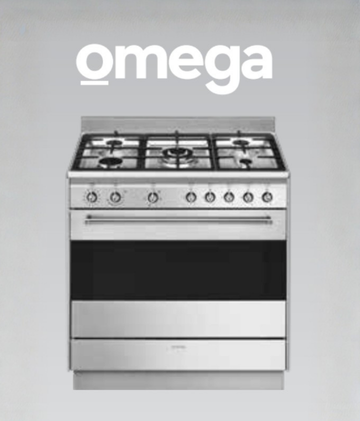- OMEGA – 900mm wide freestanding electric oven and gas cooktop.